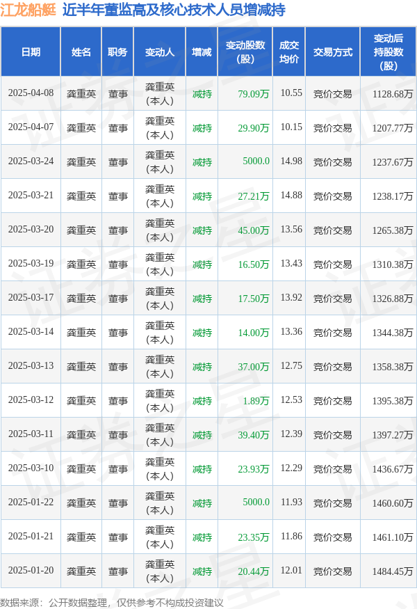 江龙船艇近半年内的董监高及核心技术人员增减持详情如下: